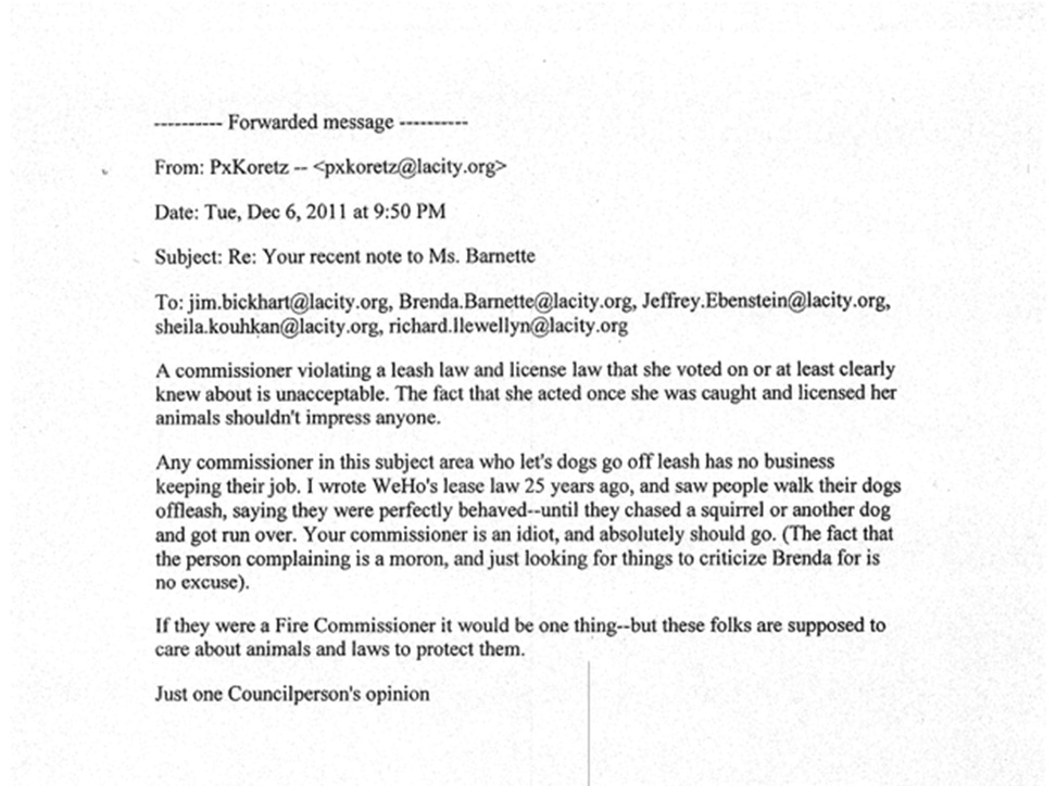 Koretz, it should be noted, was a staunch defender of controversial LAAS GM Brenda Barnette, who had a major conflict of interest: her daughter was employed by Best Friends while these deals were made and rules were broken for years. Koretz knew this, did nothing about it and even sent out attack emails…which he explicitly denied sending…until shown them.